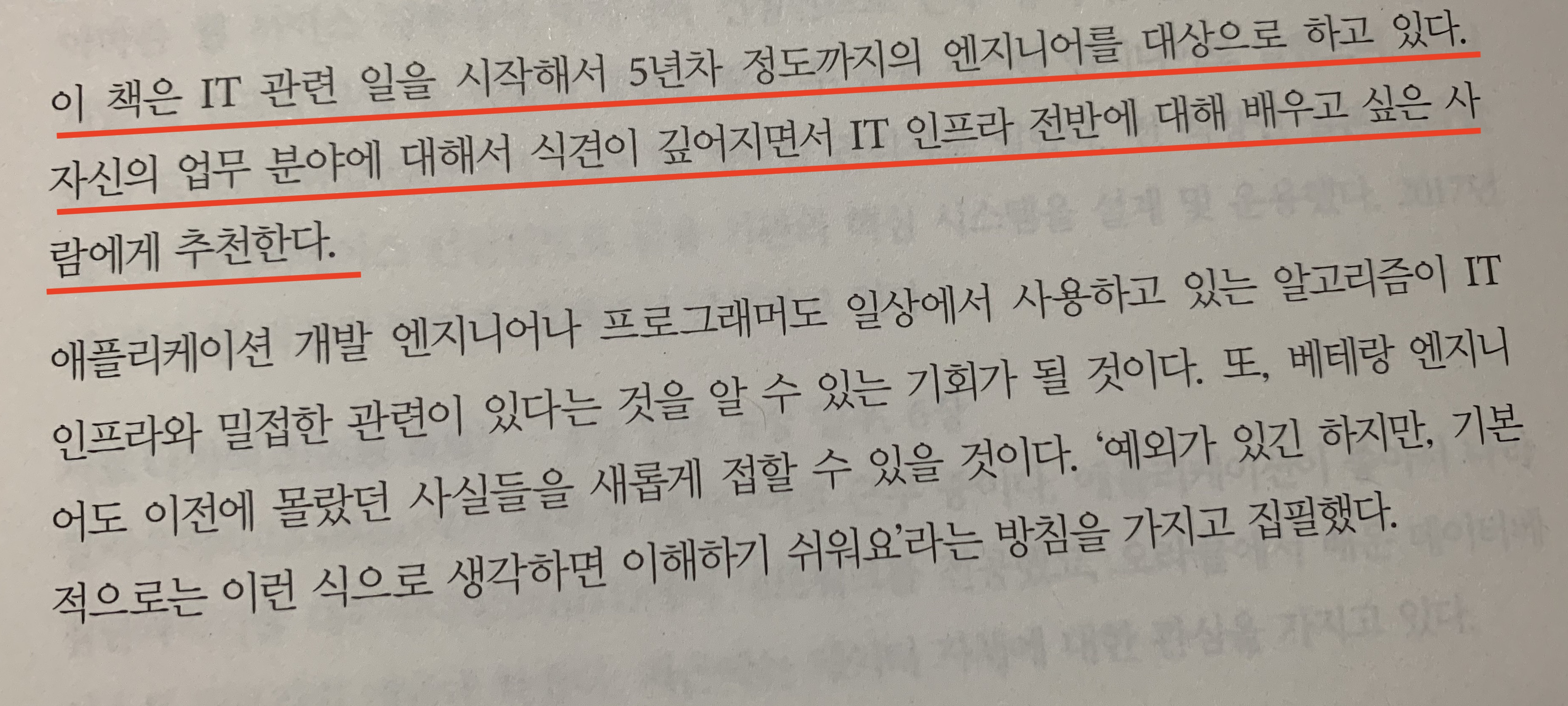 어느 정도 개발 공부를 해본 친구들이 평상시 내가 잘 알고 있다 생각하는 서버, CPU, 네트워크, 부하와 같은 키워드들을 다시 한번 살펴보면서 시야를 조금 더 넓힐 수 있는 그런 좋은 책이다.