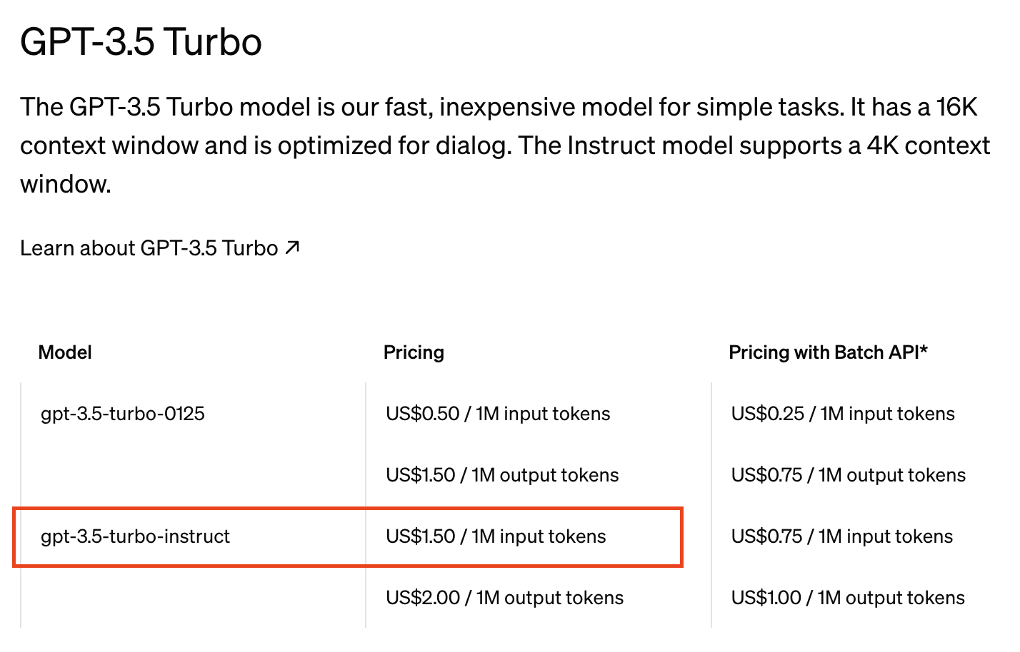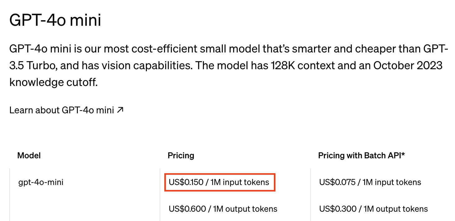1M 기준, 3.5-turbo 1M token당 $1.5에 비하여 4o-mini는 1M token당 $0.15로 무려 10배 저렴해졌다!