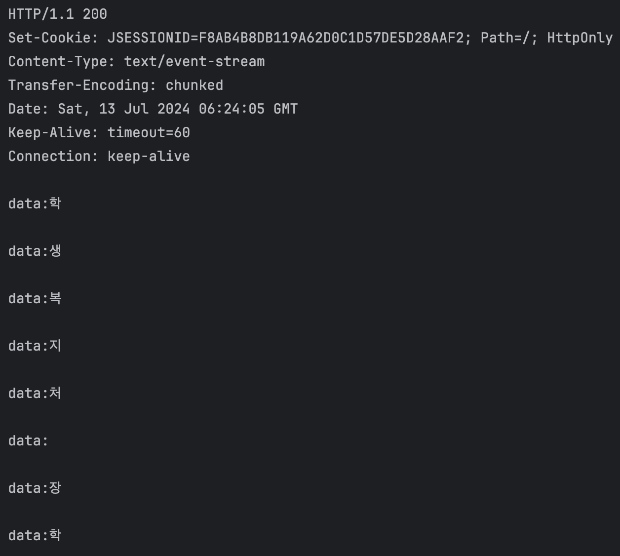 응답의 미디어 타입은 text/event-stream입니다. 이때 Transfer-Encoding 헤더의 값을 chuncked로 설정합니다. 서버는 동적으로 생성된 콘텐츠를 스트리밍 하기 때문에 본문의 크기를 미리 알 수 없기 때문입니다.
