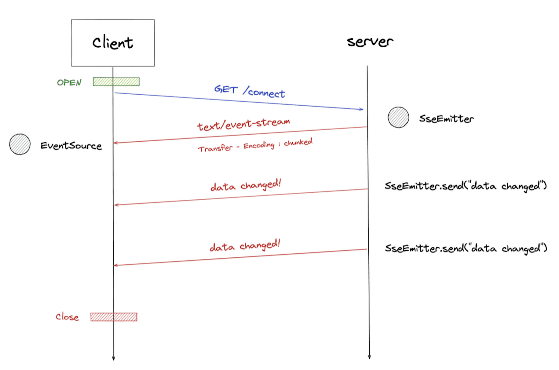 SSE는 서버와 한번 연결을 맺고 나면 일정 시간 동안 서버에서 변경이 발생할 때마다 데이터를 전송하는, 즉 서버의 Event를 stream 하는 기술입니다.