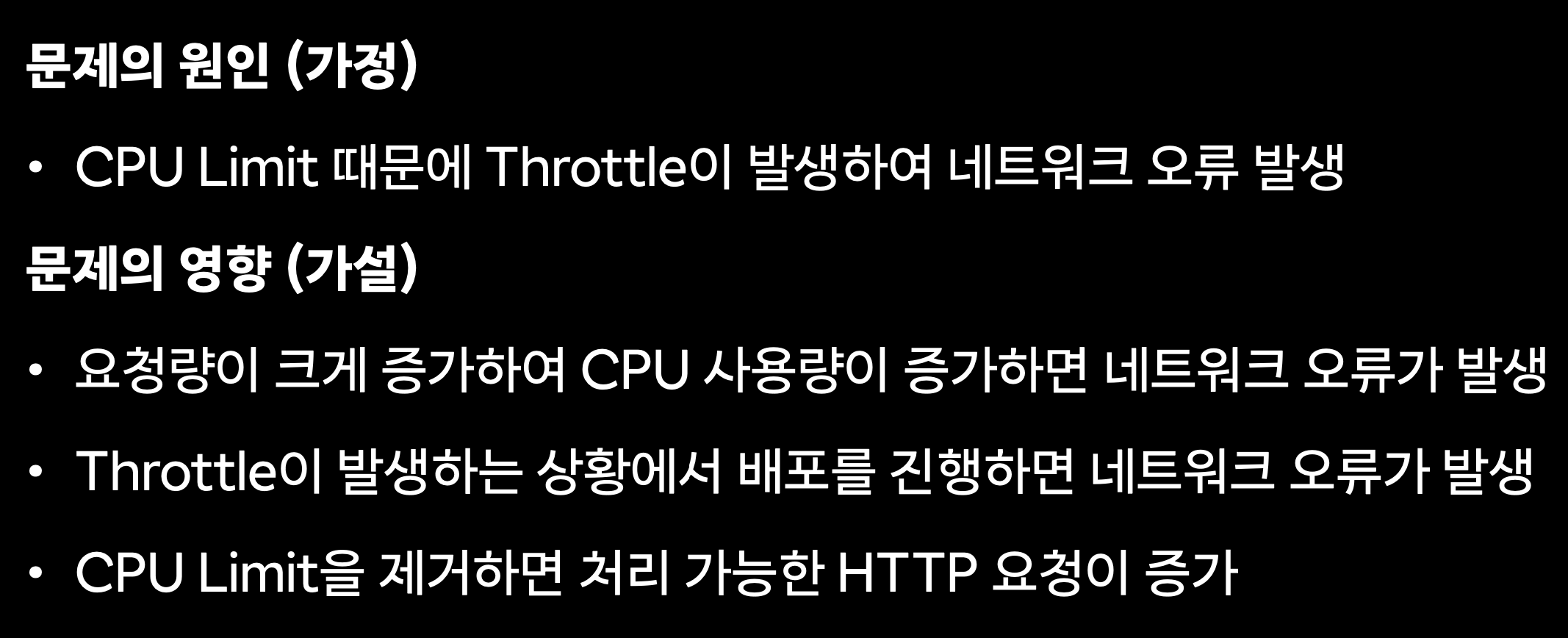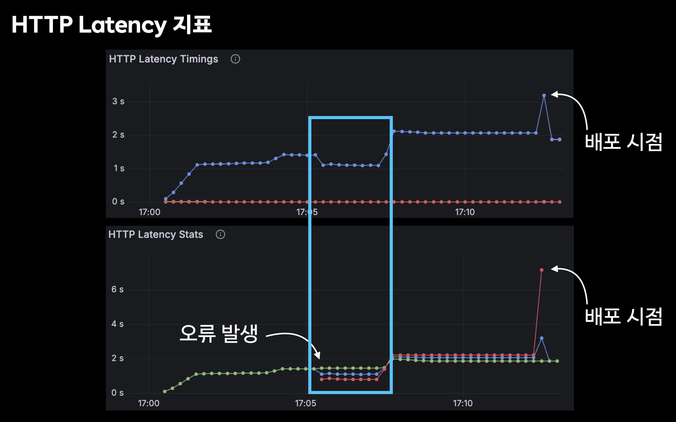 실제로 부하테스트를 통해 CPU 사용량이 증가한 상태에서, 배포를 진행하게 되었고, -> 네트워크 오류 발생 -> HTTP Latency가 급증하는 것을 확인할 수 있었다고 한다.