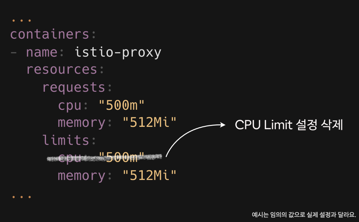 문제의 근본적 원인은 Istio의 Proxy에서의 CPU Limit 설정 때문이었음을 나중에 확인하게 되었다고 한다.