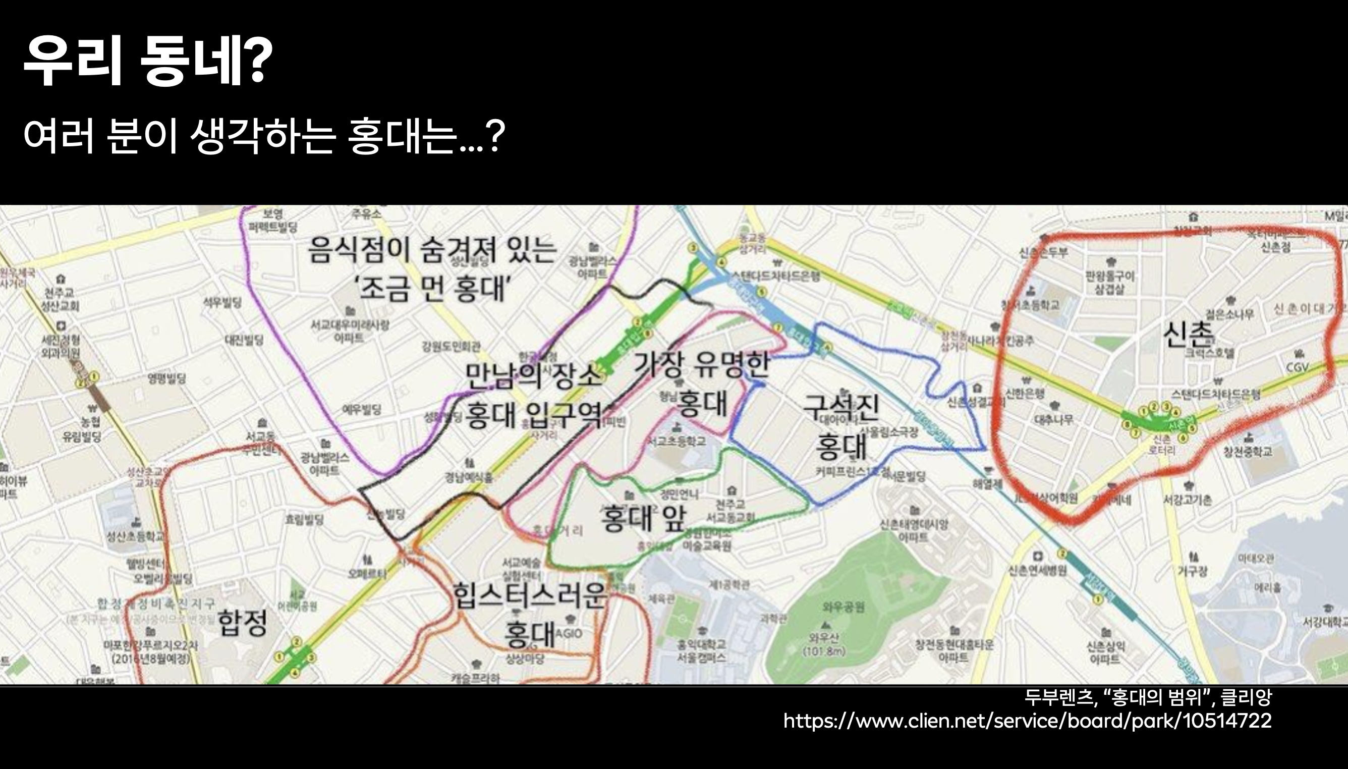에 대한 질문을 시작으로 세션을 시작해 주셨는데, 해당 질문 하나가 나의 마음을 확 끌어당기는 역할을 해주셨다! 과연 우리 동네는 어디까지일까? Geo는 홍대를 기준으로 이를 설명해 주셨다!