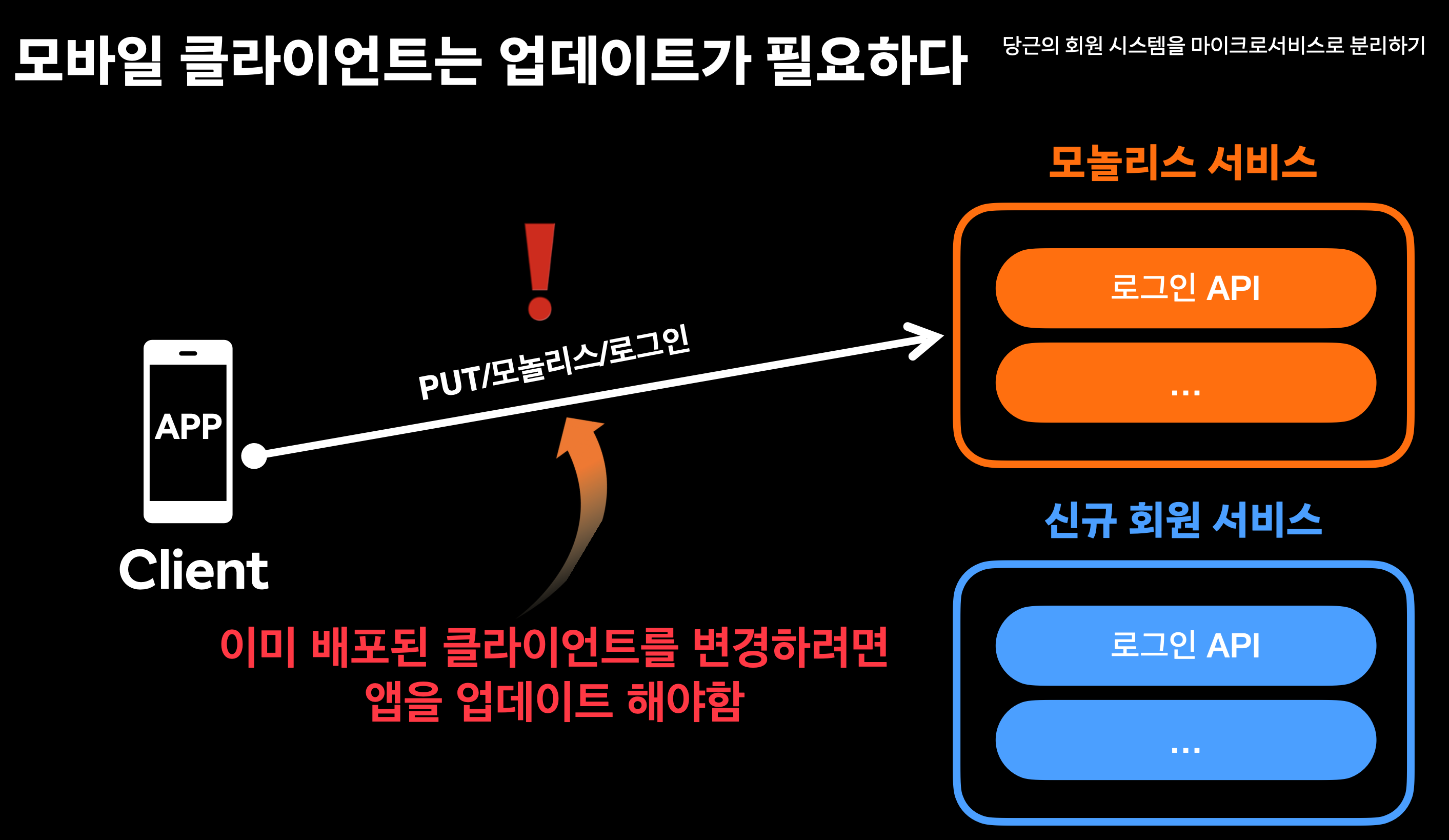 서비스를 분리하면, 기존의 서비스를 바라보고 있던 클라이언트는 신규 서비스를 어떻게 바라볼까? 앱 업데이트가 필요할 수 있다.