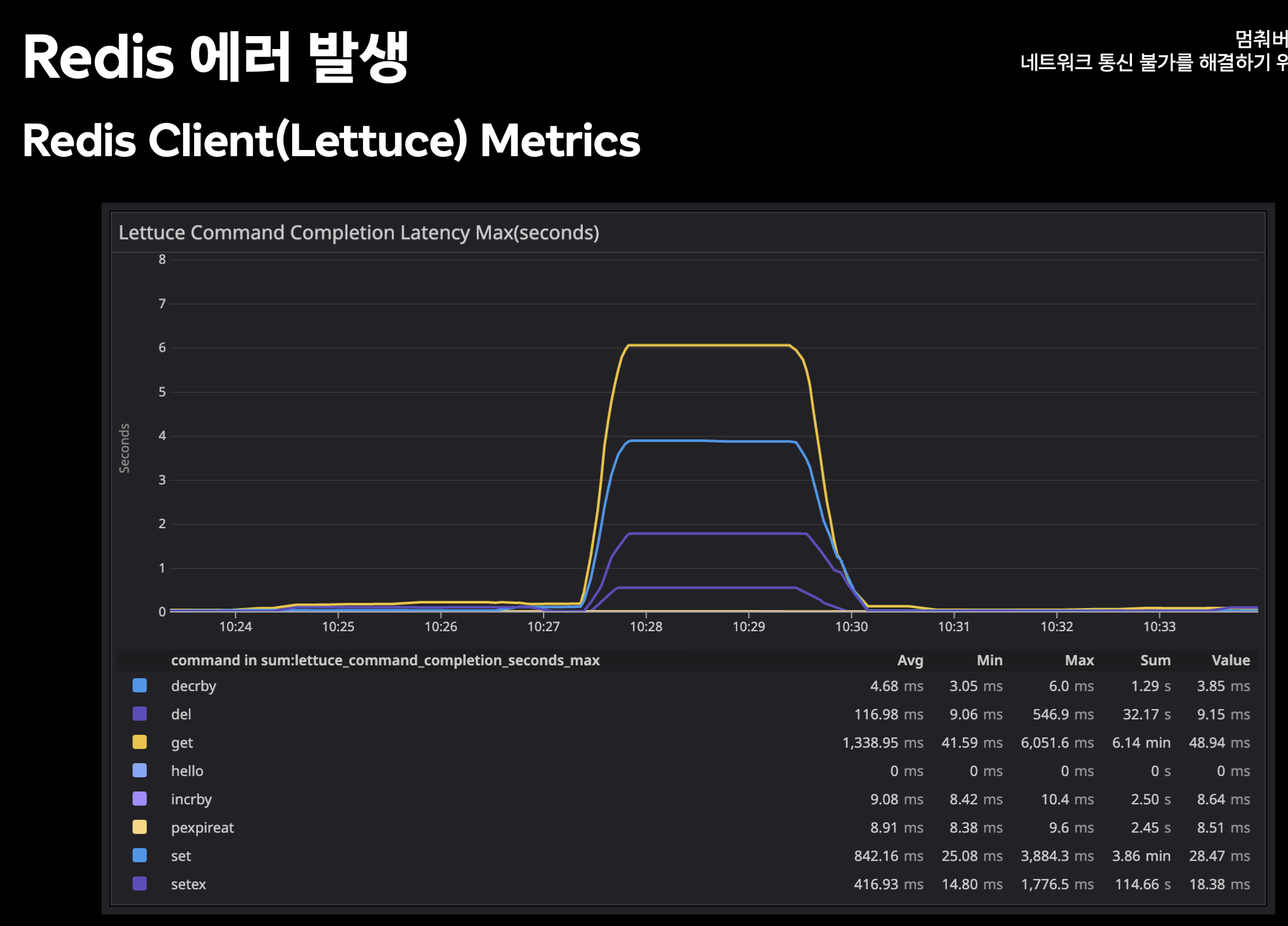어느 날 Redis에서 에러가 발생하고 있었으며, 이는 Redis Client인 Lettuce에서 Latency가 튀고 있는 현상 또한 관찰이 같이 되고 있었다고 한다.