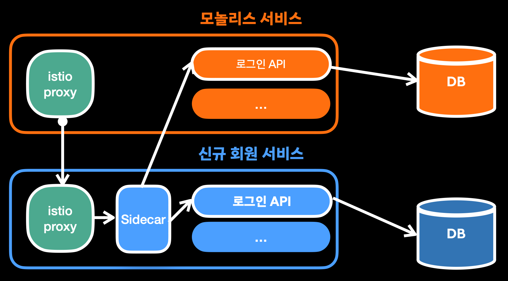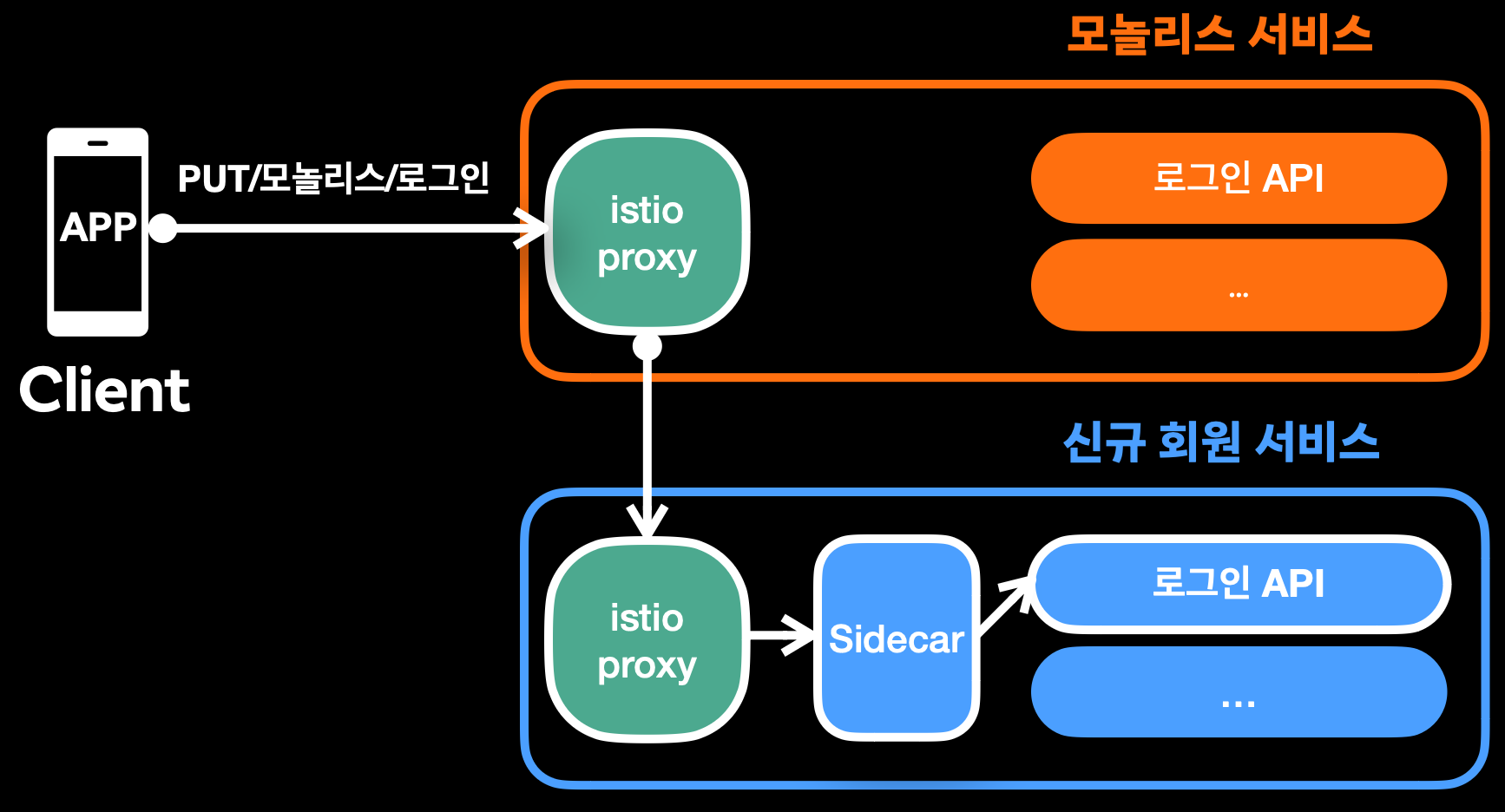 클라이언트가 모노리스를 호출해도 트래픽을 신규로 이동시켜 주는 isto의 기능을 사용하는 것이다!