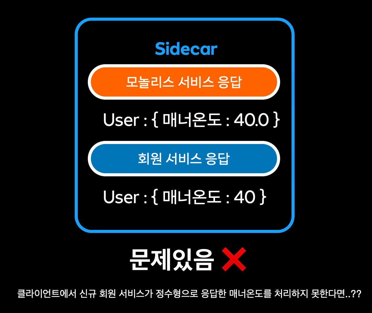 예를 들어 기존 모노리스에서는 매너온도가 40.0 (float형), 신규 서버에서는 40 (Int형)으로 반환해주는 상황이었다고 해보자.