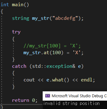 다음으로는 예외처리를 사용해 보자. 다음 코드는 string의 범위를 넘어서는 index에 값을 대입하고있는 코드이다.