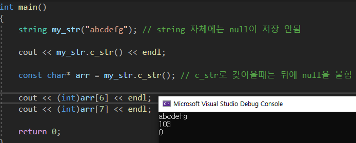 string 자체에는 null문자가 끝에 추가되지 않는다. 하지만 c_str로 갖어오면서 추가가된다.