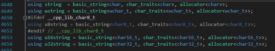 전부 보면 basic_string 이 공통되고 있다. 차이는 char, wchar_t, char16_t, char32_t 가 다르다.