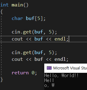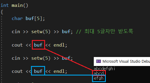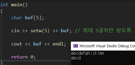 내부적으로 cin 즉, input stream이 buffer를 갖고있다. 따라서 buffer로 abc~lmn이 들어가고 그중에서 5개만 갖어오는 것 인데 char배열의 경우 마지막에 null문자가 존제하기 때문에 4자리만 있어서 문자 4개만 나온다.
