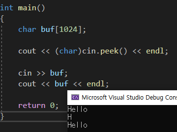 보통은 읽어들이면 버퍼에서 한글자가 빠지기 때문에 3번째 줄에서 ello 만 출력되지만, peek은 버퍼를 살짝 들여다 보기만 할뿐, 꺼내오지는 않는다.