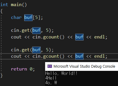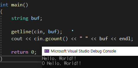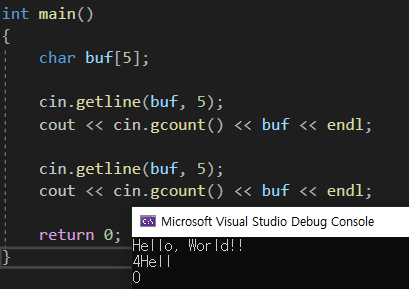 위의 코드를 보면 cin.gcount()가 0을 출력했다. 당연한것이 getline함수를 사용한 것 이지, cin.gcount() 를 사용하지 않았다.