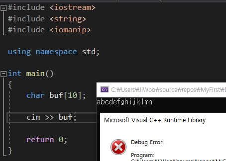 buf의 사이즈가 10인대 입력문자가 10개가 넘어가 runtime에러가 발생하고 있다.