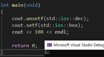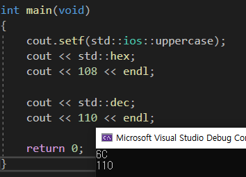 결과는 6C 로 원하는 16진수 방식으로 출력되고 있다. 다시 10진수로 돌아가고 싶으면 std::dec; 를 해주면 된다.