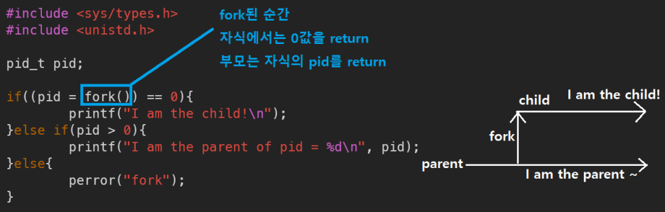 ▶ fork성공시 child process에서는 return값이 0 이고, parent에서는 child process의 pid값을 return하게 된다.