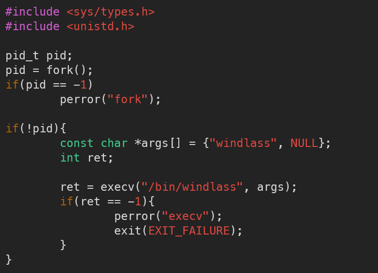 다음 예제는 새로운 process를 생성후 /bin/windlass 바이너리를 실행하는 코드이다.