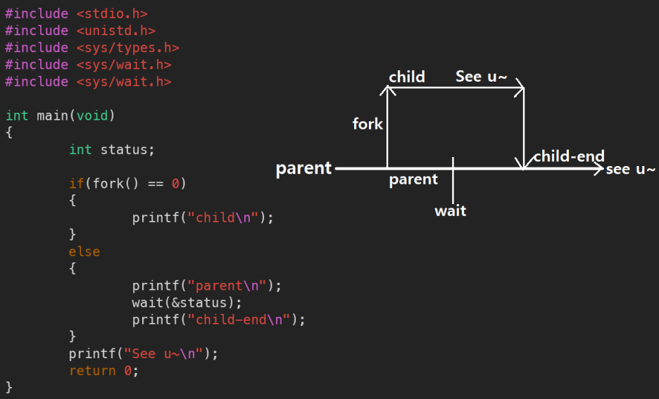 먼저 fork된 이후 child 쪽에서는 child를 출력후 if문이 종료되어 See u~를 출력한후 종료되지만, parent에서는 child가 종료될때까지 wait 시스템콜에서 suspend되어있다가, child process가 종료시 그제서야 비로소 reaping을 해준후 child-end를 출력, 이후에는 See u~를 출력한후 종료된다.