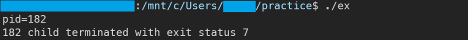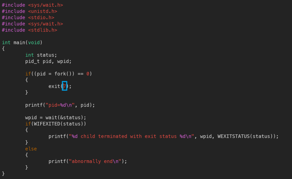 exit(7)로 종료된후 이 값은 status에 저장되어있다가 WEXITSTATUS()에서 다시 호출되어 출력된다.